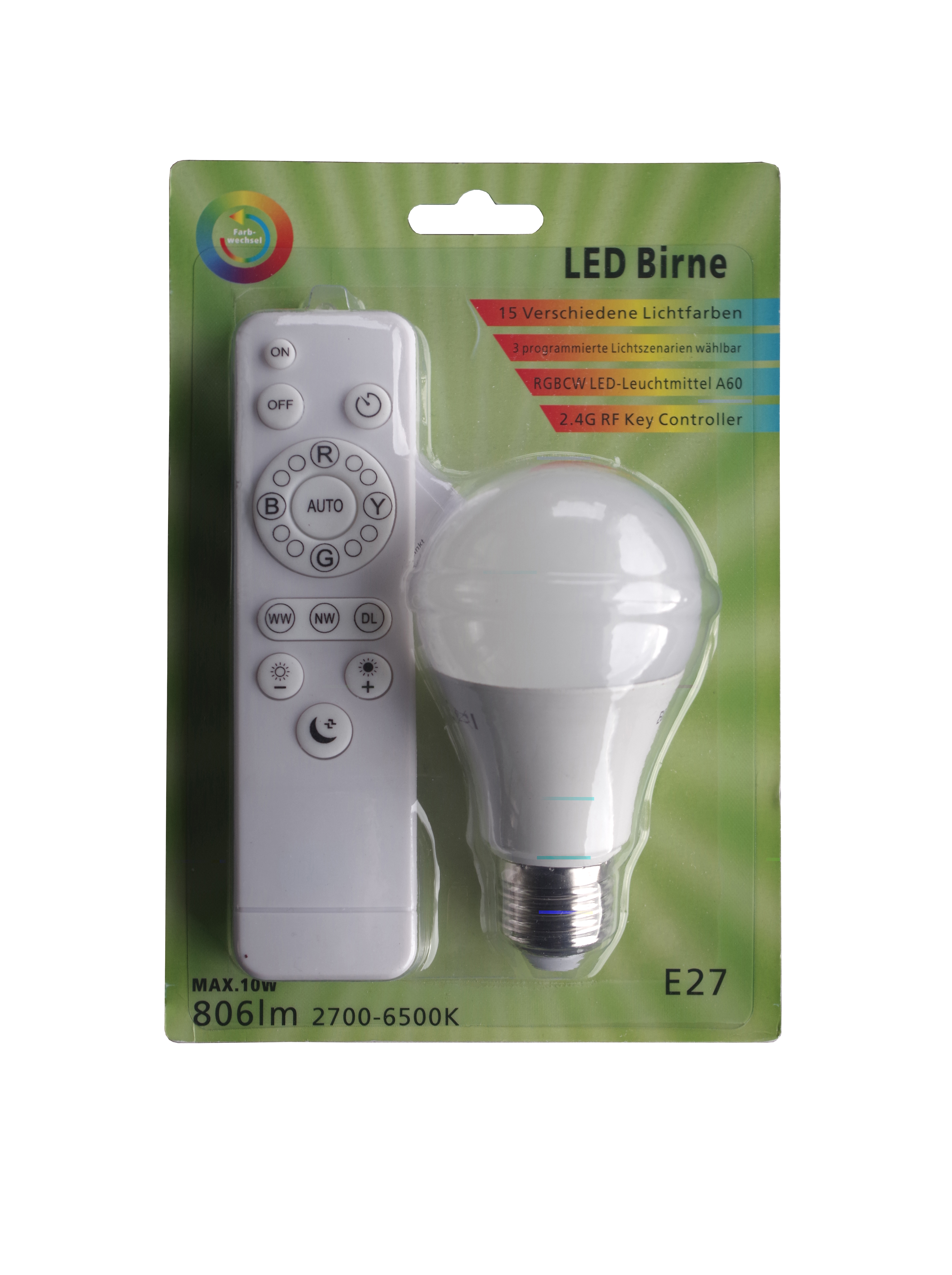 , 240 V, 10 W, E 27, 806 lm, mit Farbwechselfunktion zwischen 2700-6500 K und dimmbar, Farbwechsler erlaubt 15 verschiedene Lichtfarben, 3 programmierte Lichtszenarien wählbar