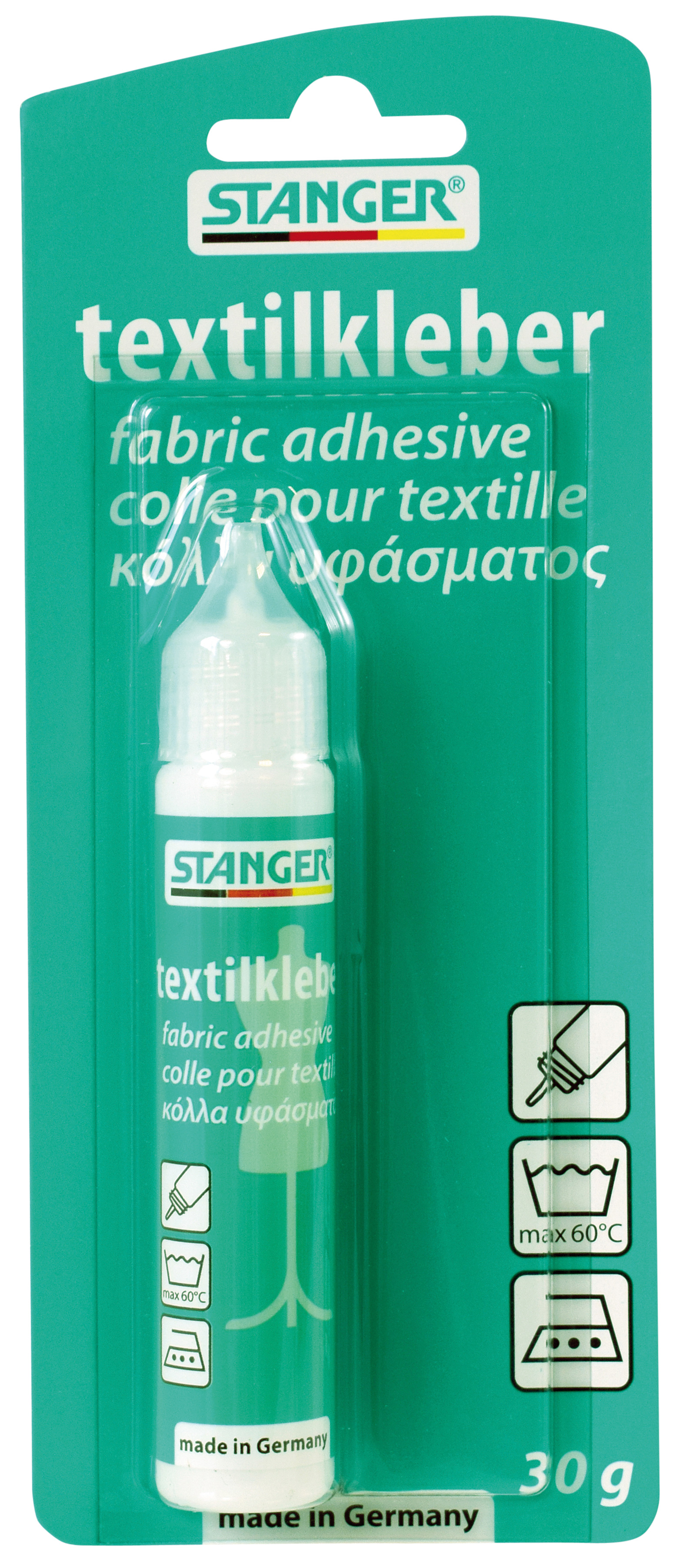 Textilkleber Marke Stanger®, 30 g Pen, lösungsmittelfrei, hochwärmefest, schnell trocknend, ein flüssiger Faden für eine saubere Klebenaht / Klebefläche. Dieser Kleber verbindet schnell, sicher und dauerhaft dicke und dünne Gewebe wie z.B. Baumwolle, Leinwand, Segeltuch, usw. miteinander