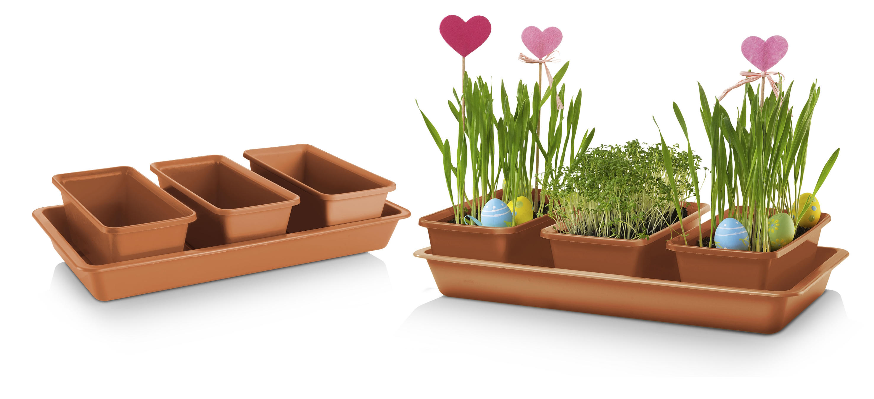 Kräutergärtchen, Minigarten, 3 kleine Pflanzkästen mit Unterschale, 40 cm, terracotta